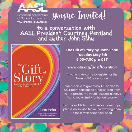 During the AASL Town Hall at 6:00 p.m. Central on May 7, AASL President Courtney Pentland will be joined by John Schu, author of The Gift of Story: Exploring the Affective Side of the Reading Life.