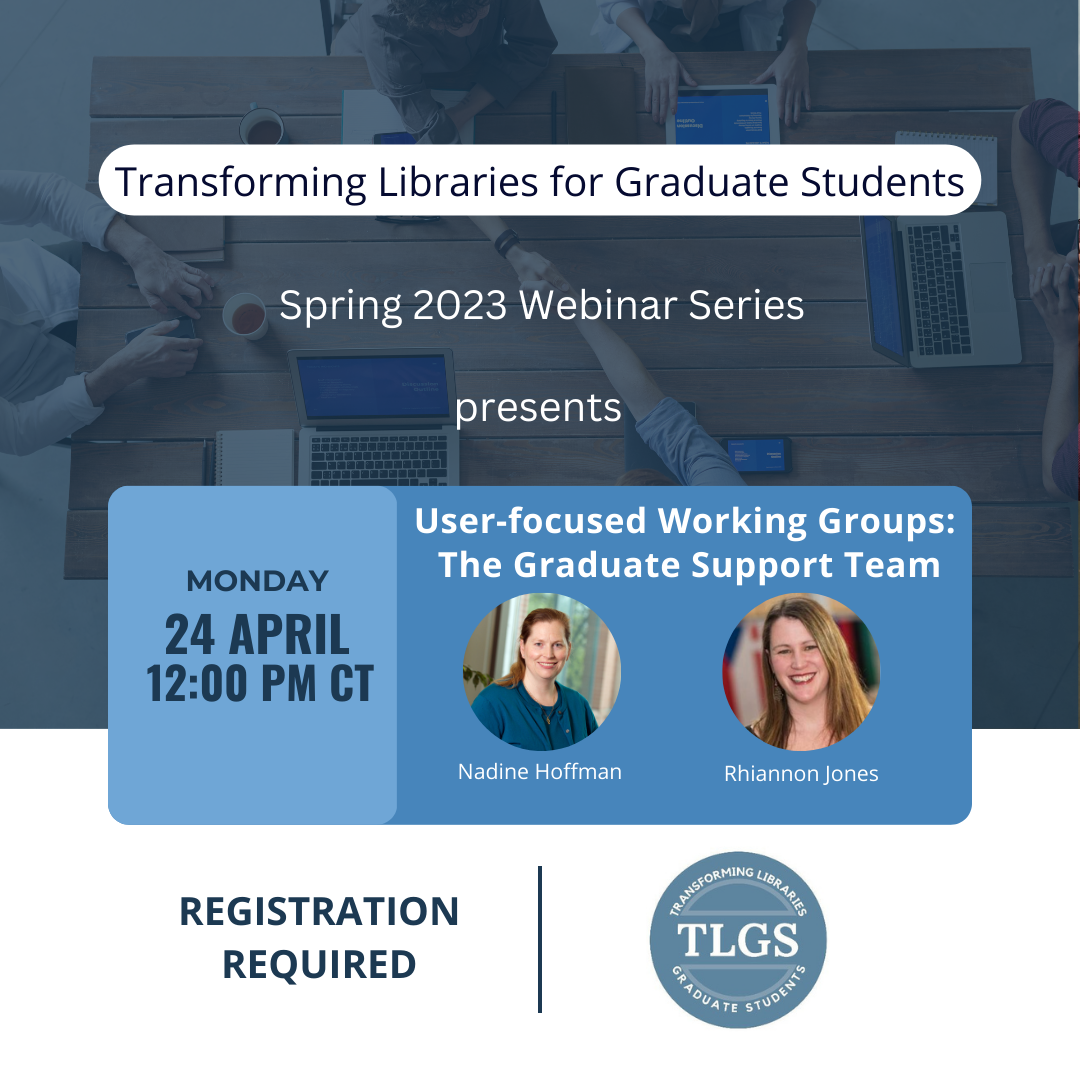 Transforming Libraries for Graduate Students (TLGS) is hosting another spring webinar Monday, April 24th at 12pm CST.