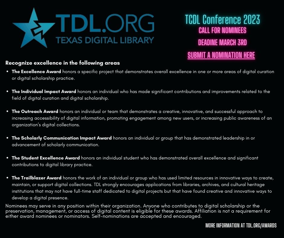 The Texas Conference of Digital Libraries invites nominations for recognition of colleagues and peers in the following areas.