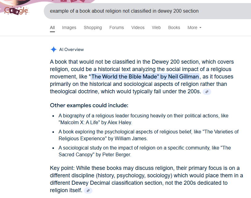 Google's AI is incorporating the search function, which is how it can generate an accurate explanation of the kinds of materials classed outside of Dewey 200 and generate the correct book titles. But the text-prediction aspect of the genAI is interfering with accurate results, which is why its making mistakes. This would be a great example to show a class to illustrate the perils of using AI for search.