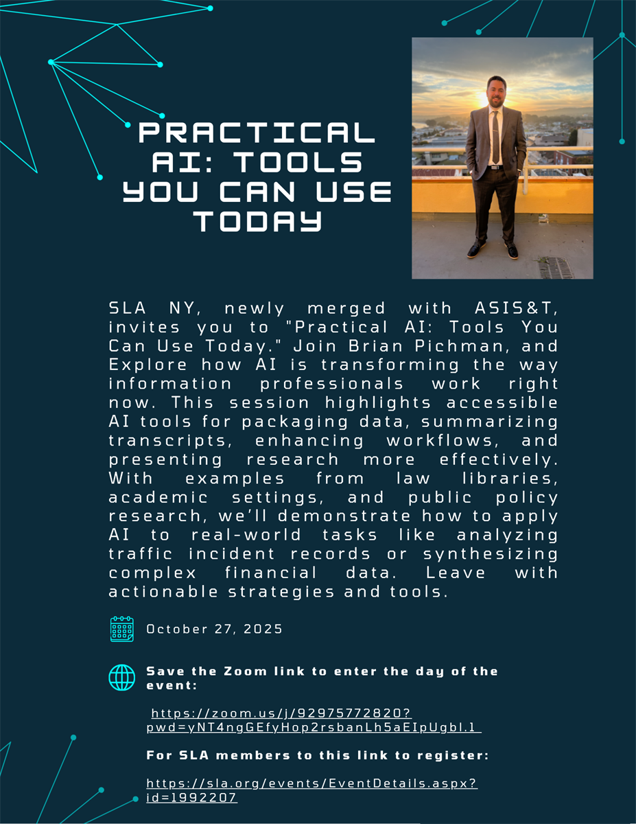 | Title: SLA NY, newly merged with ASIS&T, invites you to "Practical AI: Tools You Can Use Today" Date: Monday, Oct. 27, 2025 Time: 6-7pm EDT Description: Explore how AI is transforming the way information professionals work-right now. This session highlights accessible AI tools for packaging data, summarizing transcripts, enhancing workflows, and presenting research more effectively. With examples from law libraries, academic settings, and public policy research, we'll demonstrate how to apply AI to real-world tasks like analyzing traffic incident records or synthesizing complex financial data. Leave with actionable strategies and tools to streamline your work, impress your stakeholders, and future-proof your library's services.