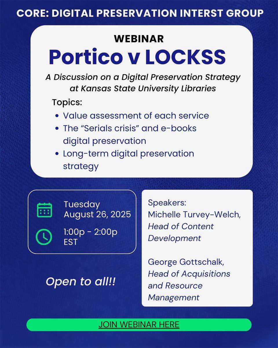 In this presentation, we will share our e-journal overlap analysis and discuss the early stages of a broader digital preservation strategy-one that is still evolving at K-State and across the library field. The quieter "serials crisis" continues, and we still need to investigate e-books digital preservation