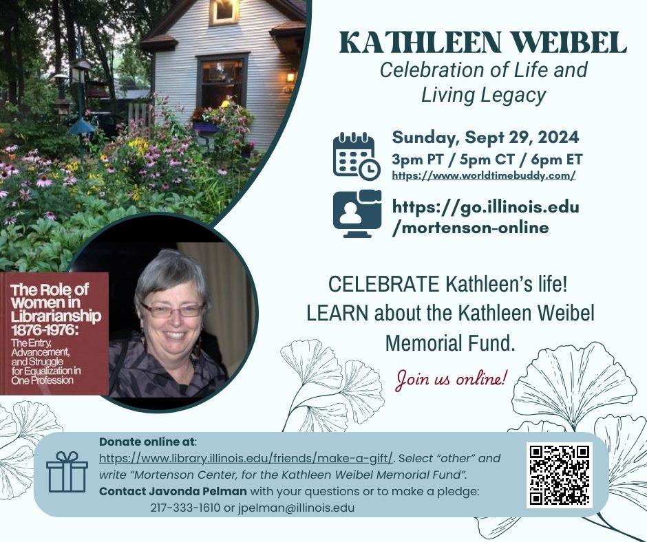 Our dear friend Kathleen Weibel, 79, librarian extraordinaire, mentor, educator, and international and women rights advocate, passed July 29, 2024 at her home. <obituary1, obituary2> Her friends are organizing an online event on Sept. 29th, 3pm PT/5pm CT/ 6pm ET, to celebrate her life and create a living legacy.