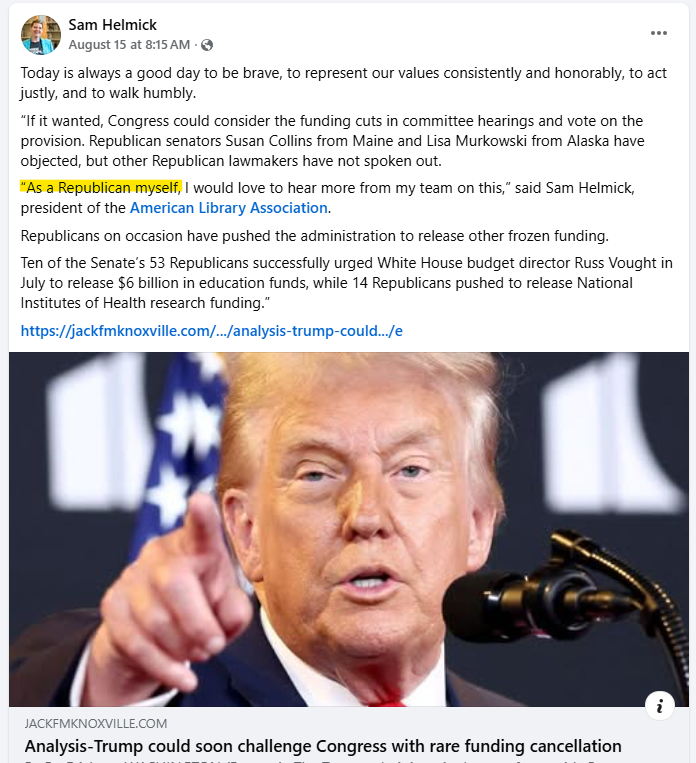 I'm curious if anyone else has run across this Facebook post or other instances in which ALA President Sam Helmick openly identifies as a Republican, possibly as a show of trying to "reach across the aisle" to an administration and a party that has actively: